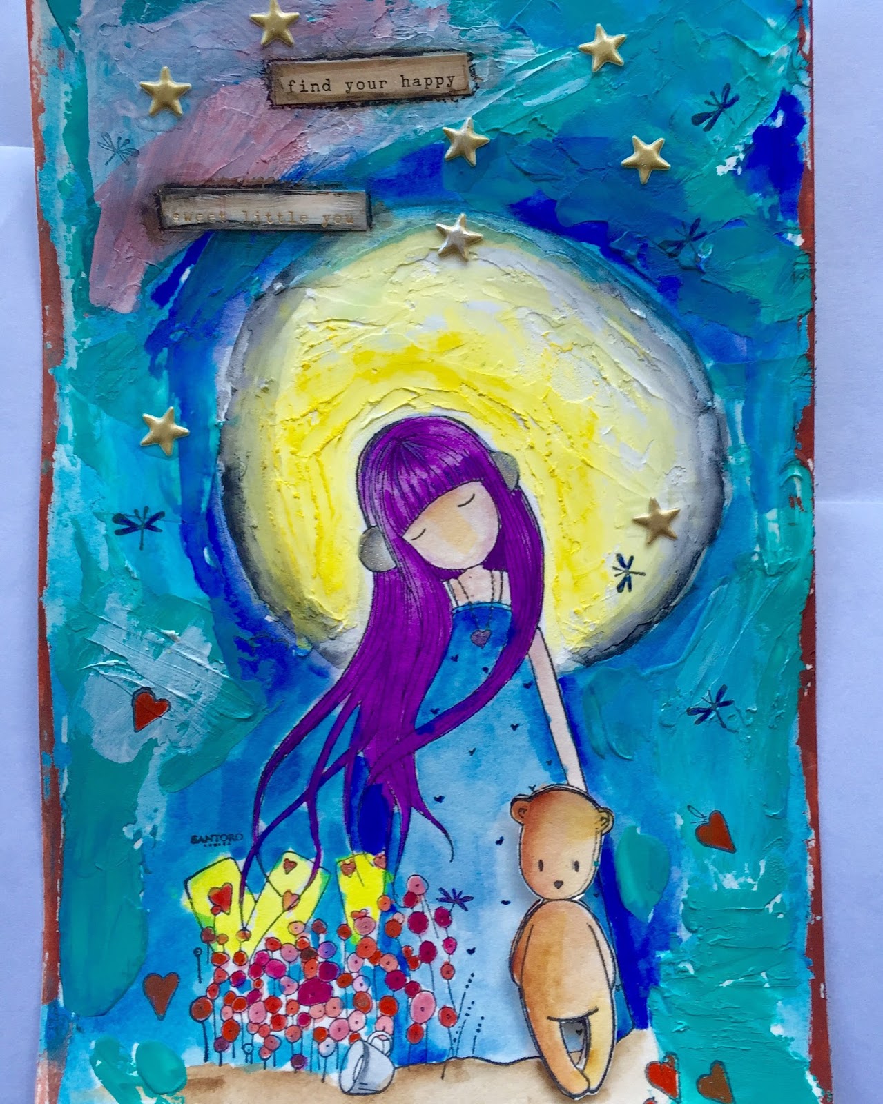 I color her with watercolor, the background is molding paste mixed with dylusions paint and watercolor. The bear is colored twice and one on top with dimensional adhesive.