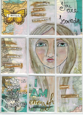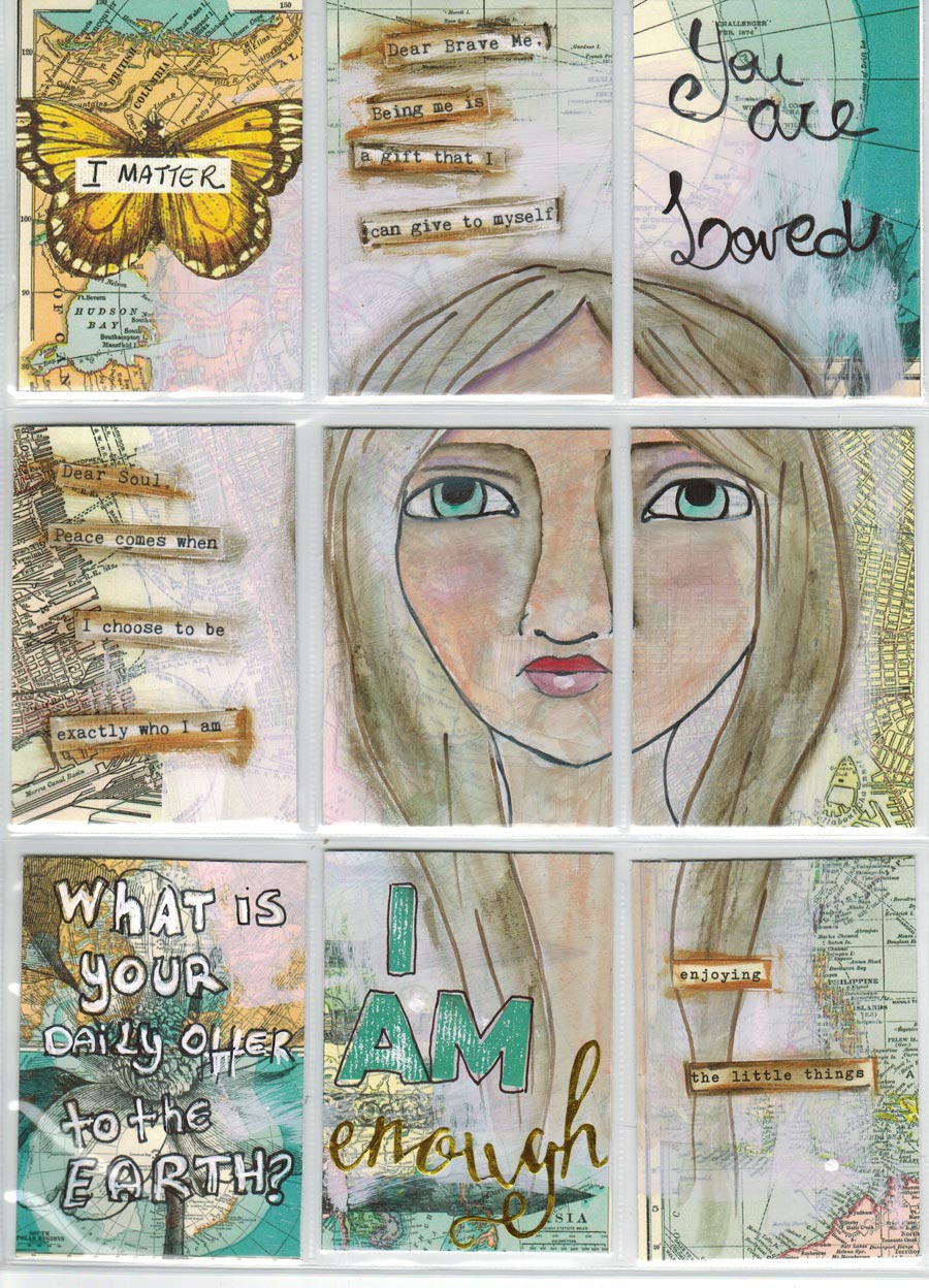 I discovered through this Free online class about Art Journal pocket cards. I thought was a fantastic idea to do some of truth cards from Brave GirlsClub later but I wanted to experiment with this free download from the class which is the paper background. I loved the process it was a lot of fun and love how they look. There is something about putting things in pockets.